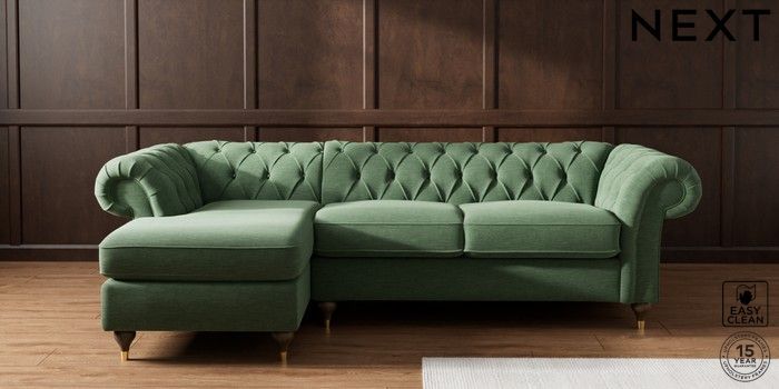7.2.10 Gosford Highback II Deep Sit Medium Sofa Chaise - Left Hand Fine Chenille Easy Clean Mid Khaki Green Modern Turned Metal Cap - Mid | Made Click here to use our website with more accessibility support, for example screen readers