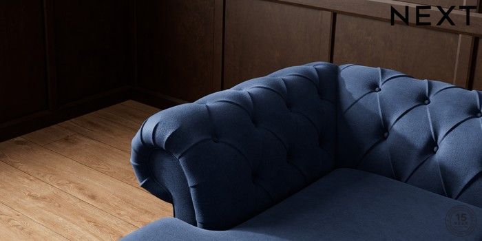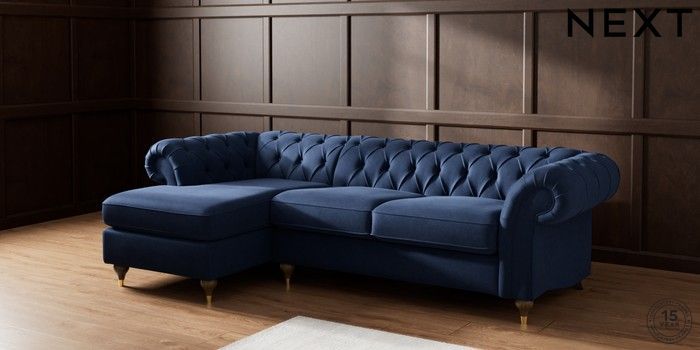 7.2.10 Gosford Highback II Deep Sit Medium Sofa Chaise - Left Hand Luxe Chenille Navy Blue Modern Turned Metal Cap - Mid | Made Click here to use our website with more accessibility support, for example screen readers