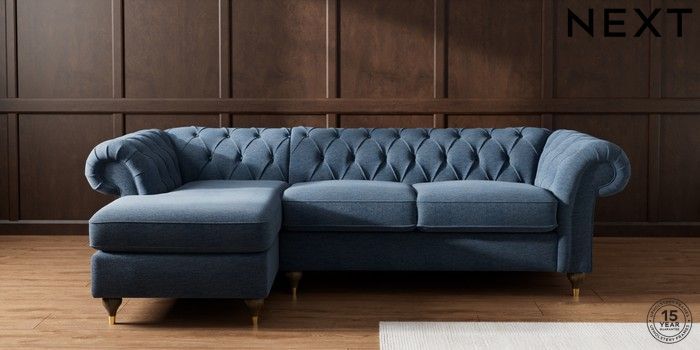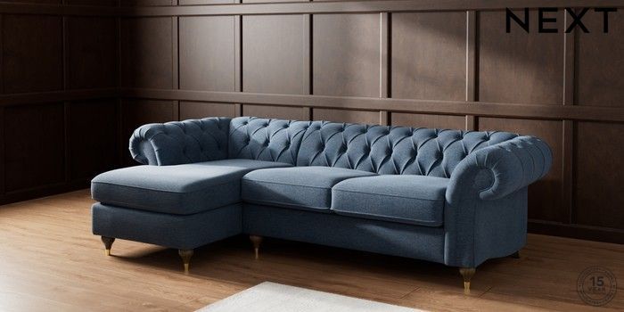 7.2.10 Gosford Highback II Deep Sit Medium Sofa Chaise - Left Hand Ripple Chenille Dark Blue Modern Turned Metal Cap - Mid | Made Click here to use our website with more accessibility support, for example screen readers