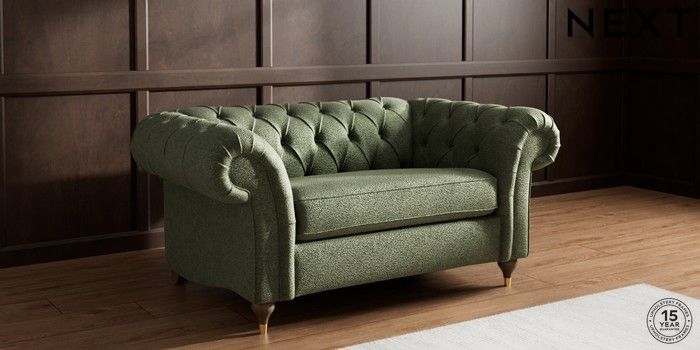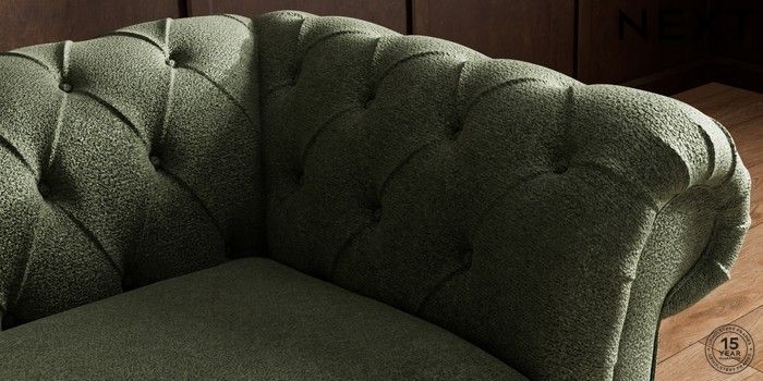 7.2.10 Gosford II Deep Sit 2 Seater Small Sofa Boucle Chenille Dark Moss Green Modern Turned Metal Cap - Mid | Made Click here to use our website with more accessibility support, for example screen readers