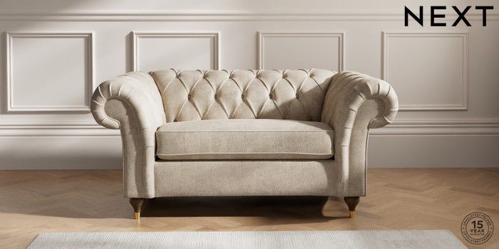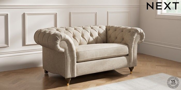 7.2.10 Gosford II Deep Sit 2 Seater Small Sofa Plush Chenille Light Natural Modern Turned Metal Cap - Mid | Made Click here to use our website with more accessibility support, for example screen readers