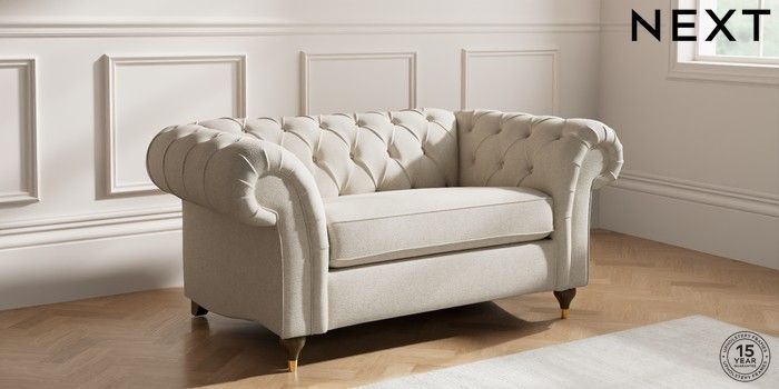 7.2.10 Gosford II Deep Sit 2 Seater Small Sofa Tweedy Chenille Oyster Modern Turned Metal Cap - Mid | Made Click here to use our website with more accessibility support, for example screen readers