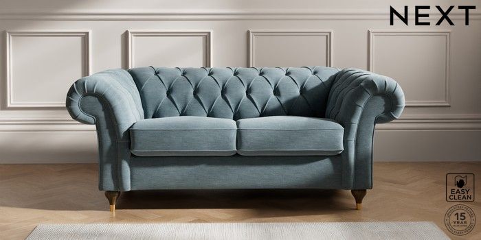 7.2.10 Gosford II Deep Sit 2 Seater Sofa Fine Chenille Easy Clean Mid Blue Modern Turned Metal Cap - Mid | Made Click here to use our website with more accessibility support, for example screen readers