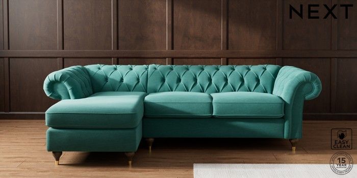 7.2.10 Gosford II Deep Sit Medium Sofa Chaise - Left Hand Fine Chenille Easy Clean Dark Juniper Green Modern Turned Metal Cap - Mid | Made Click here to use our website with more accessibility support, for example screen readers