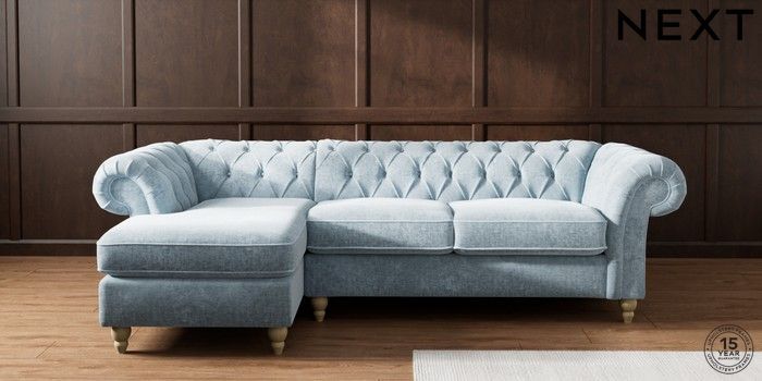 7.2.10 Gosford II Deep Sit Medium Sofa Chaise - Left Hand Plush Chenille Light Blue Low Turned - Light | Made Click here to use our website with more accessibility support, for example screen readers