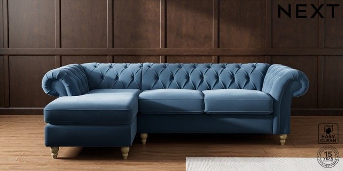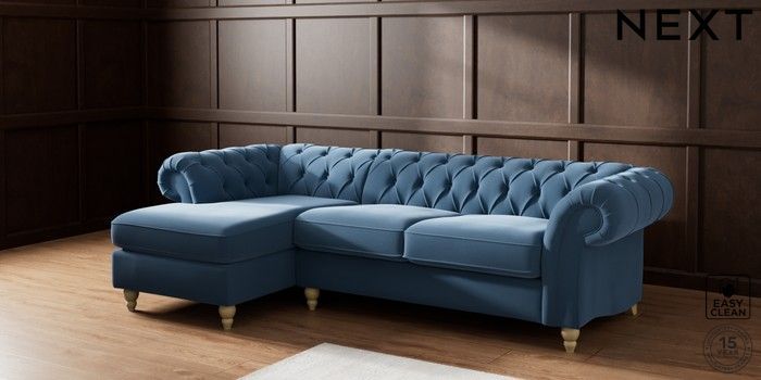 7.2.10 Gosford II Deep Sit Medium Sofa Chaise - Left Hand Plush Velvet Easy Clean Airforce Blue Low Turned - Light | Made Click here to use our website with more accessibility support, for example screen readers