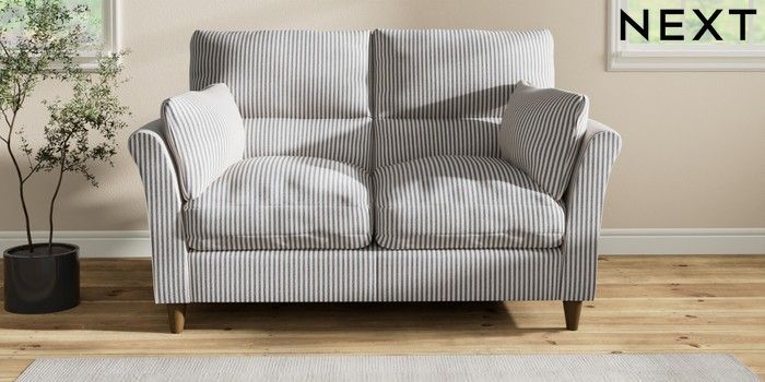 7.2.10 Hartley Highback Relaxed Sit 2 Seater Sofa Chenille Stripe Slate Blue Low Conical - Mid | Made Click here to use our website with more accessibility support, for example screen readers