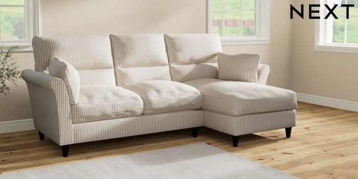 7.2.10 Hartley Highback Relaxed Sit Medium Sofa Chaise - Right Hand Chenille Stripe Natural Low Conical - Dark | Made Click here to use our website with more accessibility support, for example screen readers