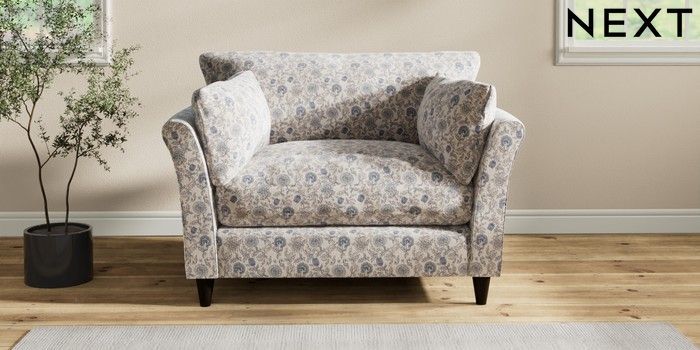 7.2.10 Hartley Relaxed Sit Love Seat Relaxed Linen Look Print Woodblock Floral Blue Low Conical - Dark | Made Click here to use our website with more accessibility support, for example screen readers