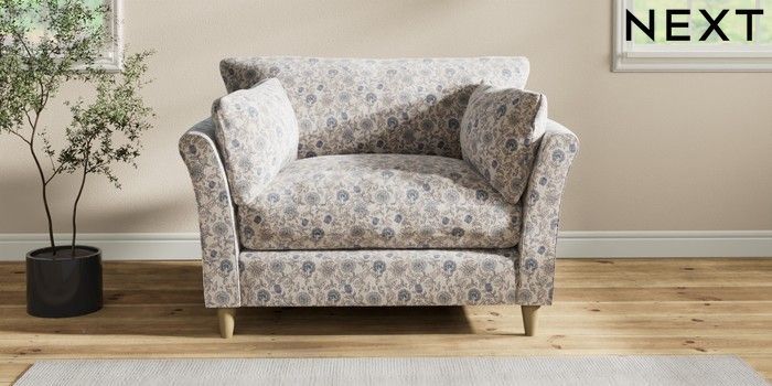 7.2.10 Hartley Relaxed Sit Love Seat Relaxed Linen Look Print Woodblock Floral Blue Low Conical - Light | Made Click here to use our website with more accessibility support, for example screen readers