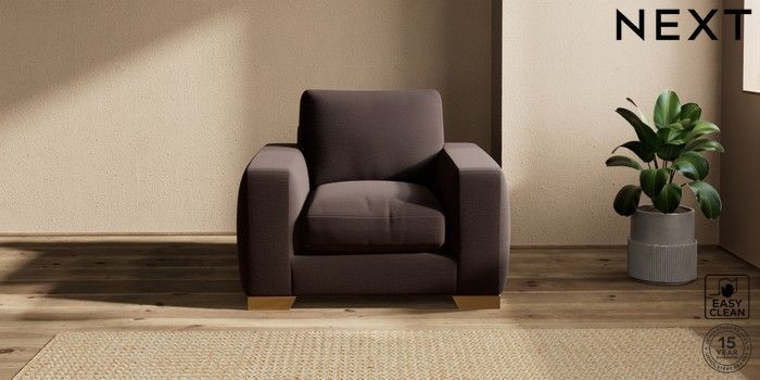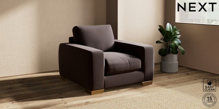7.2.10 Houghton Deep Relaxed Sit Armchair Fine Chenille Easy Clean Chocolate Brown Large Square Angle - Brushed Brass | Made Click here to use our website with more accessibility support, for example screen readers