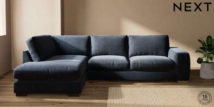 7.2.10 Houghton Deep Relaxed Sit Large Corner Chaise - Left Hand Boucle Chenille Dark Slate Blue Large Square Angle - Brushed Brass | Made Click here to use our website with more accessibility support, for example screen readers