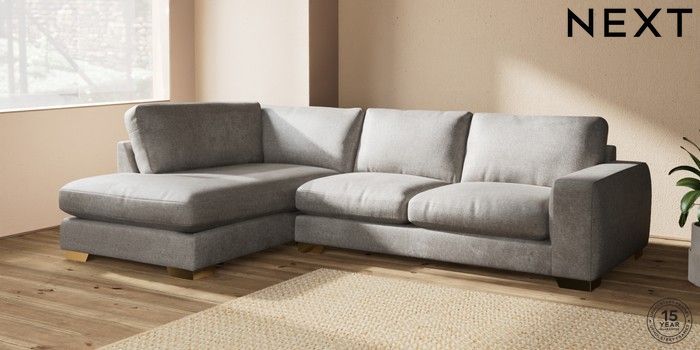 7.2.10 Houghton Deep Relaxed Sit Large Corner Chaise - Left Hand Plush Chenille Light Grey Large Square Angle - Brushed Brass | Made Click here to use our website with more accessibility support, for example screen readers