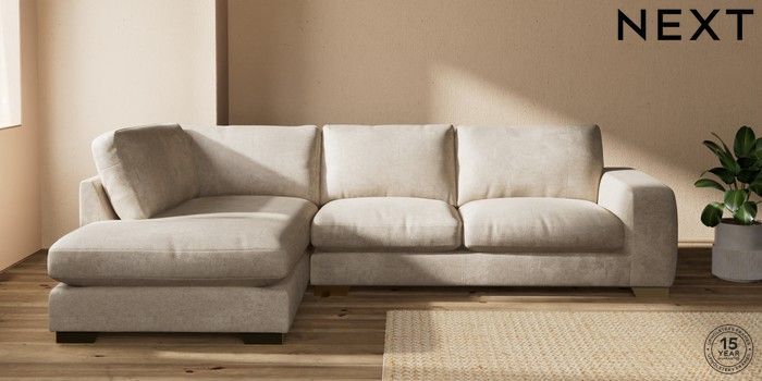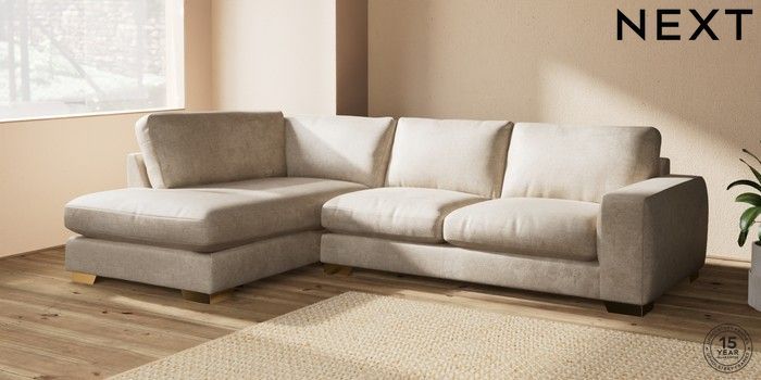 7.2.10 Houghton Deep Relaxed Sit Large Corner Chaise - Left Hand Plush Chenille Light Natural Large Square Angle - Brushed Brass | Made Click here to use our website with more accessibility support, for example screen readers