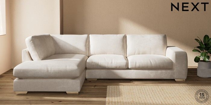 7.2.10 Houghton Deep Relaxed Sit Large Corner Chaise - Left Hand Plush Chenille Oyster Large Square Angle - Chrome Metal | Made Click here to use our website with more accessibility support, for example screen readers
