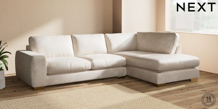 7.2.10 Houghton Deep Relaxed Sit Large Corner Chaise - Right Hand Plush Chenille Oyster Large Square Angle - Brushed Brass | Made Click here to use our website with more accessibility support, for example screen readers