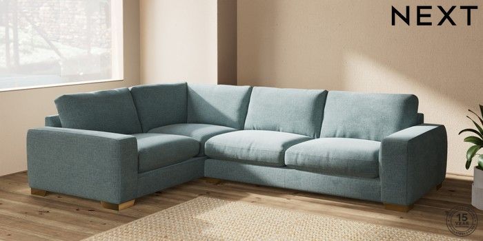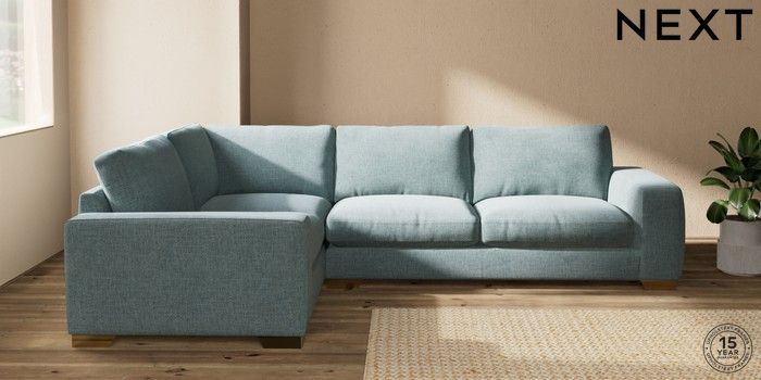 7.2.10 Houghton Deep Relaxed Sit Large Corner Sofa - Left Hand Chunky Chenille Light Teal Green Large Square Angle - Brushed Brass | Made Click here to use our website with more accessibility support, for example screen readers