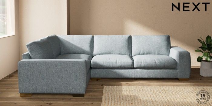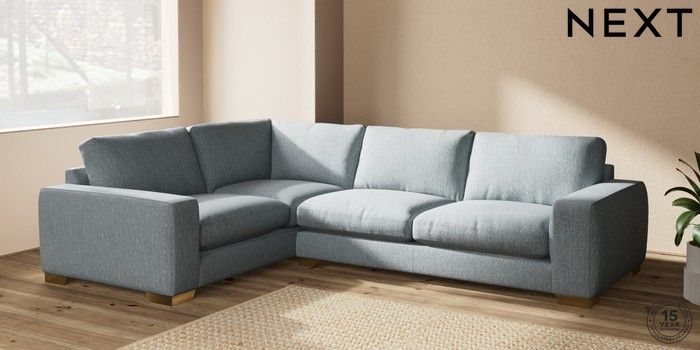 7.2.10 Houghton Deep Relaxed Sit Large Corner Sofa - Left Hand Chunky Weave Mid Blue Large Square Angle - Brushed Brass | Made Click here to use our website with more accessibility support, for example screen readers