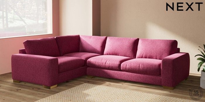 7.2.10 Houghton Deep Relaxed Sit Large Corner Sofa - Left Hand Cotswold Chenille Dark Raspberry Pink Large Square Angle - Brushed Brass | Made Click here to use our website with more accessibility support, for example screen readers