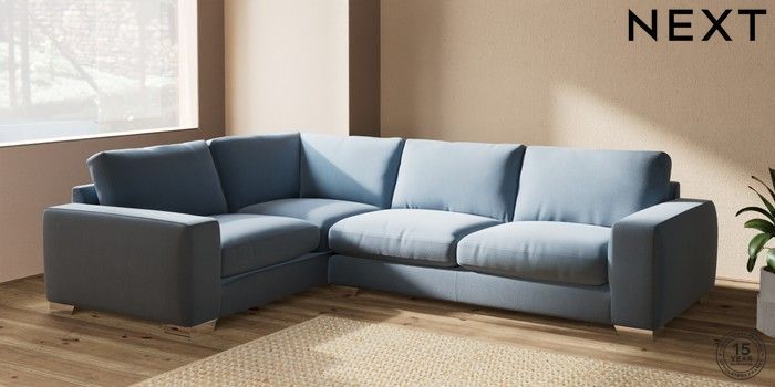 7.2.10 Houghton Deep Relaxed Sit Large Corner Sofa - Left Hand Relaxed Linen Look Mid Blue Large Square Angle - Chrome Metal | Made Click here to use our website with more accessibility support, for example screen readers