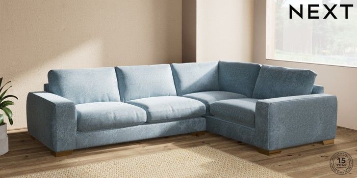 7.2.10 Houghton Deep Relaxed Sit Large Corner Sofa - Right Hand Plush Chenille Light Blue Large Square Angle - Brushed Brass | Made Click here to use our website with more accessibility support, for example screen readers