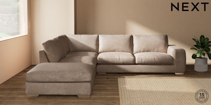 7.2.10 Houghton Deep Relaxed Sit Large Open End Corner Chaise - Left Hand Plush Chenille Mid Natural Large Square Angle - Chrome Metal | Made Click here to use our website with more accessibility support, for example screen readers