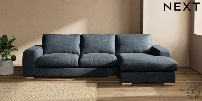7.2.10 Houghton Deep Relaxed Sit Large Sofa Chaise - Right Hand Plush Chenille Slate Blue Large Square Angle - Chrome Metal | Made Click here to use our website with more accessibility support, for example screen readers