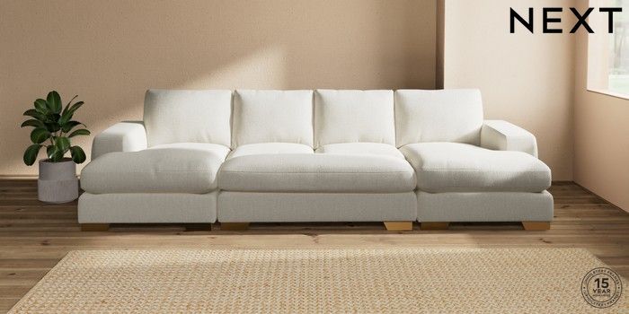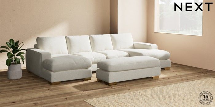 7.2.10 Houghton Deep Relaxed Sit Large - U Shaped Double Chaise with Footstool Chunky Texture Oyster Large Square Angle - Brushed Brass | Made Click here to use our website with more accessibility support, for example screen readers