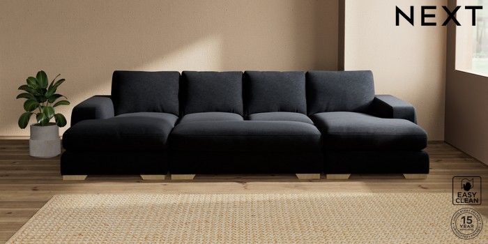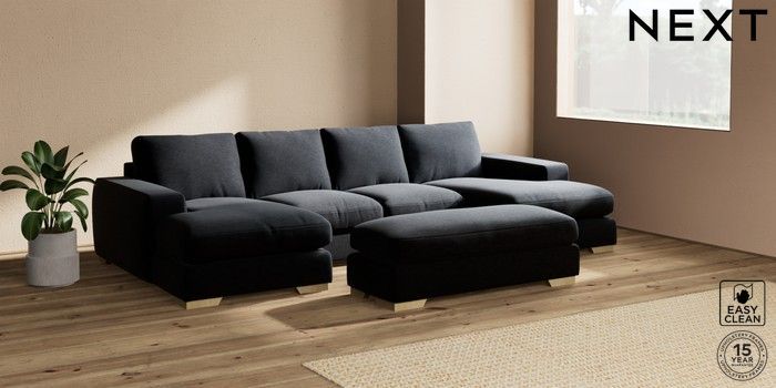 7.2.10 Houghton Deep Relaxed Sit Large - U Shaped Double Chaise with Footstool Fine Chenille Easy Clean Black Large Square Angle - Light | Made Click here to use our website with more accessibility support, for example screen readers