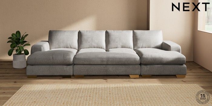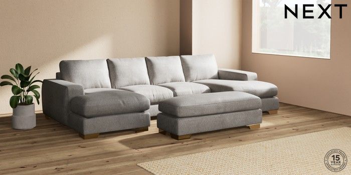 7.2.10 Houghton Deep Relaxed Sit Large - U Shaped Double Chaise with Footstool Plush Chenille Light Grey Large Square Angle - Brushed Brass | Made Click here to use our website with more accessibility support, for example screen readers