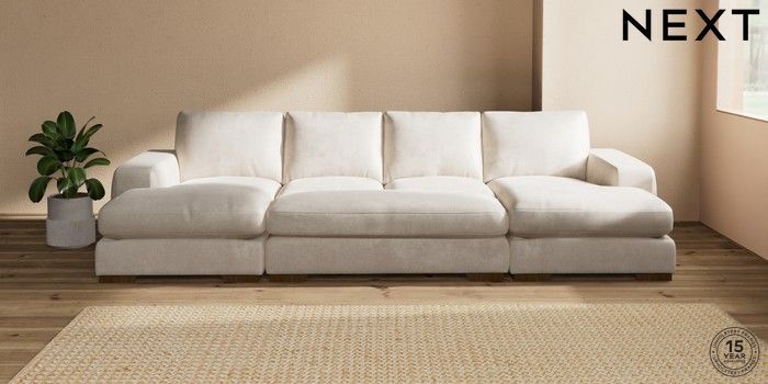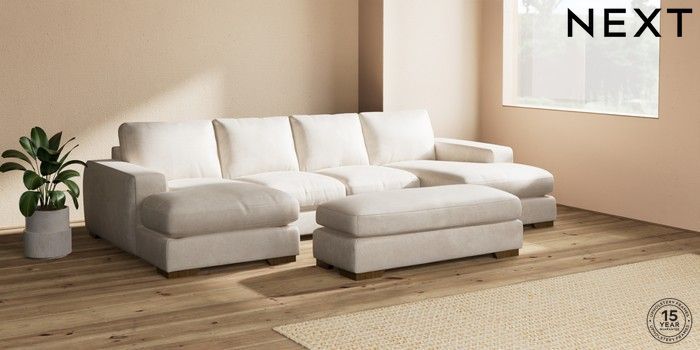 7.2.10 Houghton Deep Relaxed Sit Large - U Shaped Double Chaise with Footstool Plush Chenille Oyster Large Square Angle - Mid | Made Click here to use our website with more accessibility support, for example screen readers