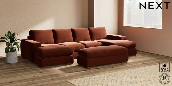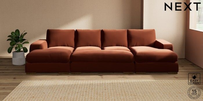 7.2.10 Houghton Deep Relaxed Sit Large - U Shaped Double Chaise with Footstool Plush Velvet Easy Clean Ginger Orange Large Square Angle - Mid | Made Click here to use our website with more accessibility support, for example screen readers