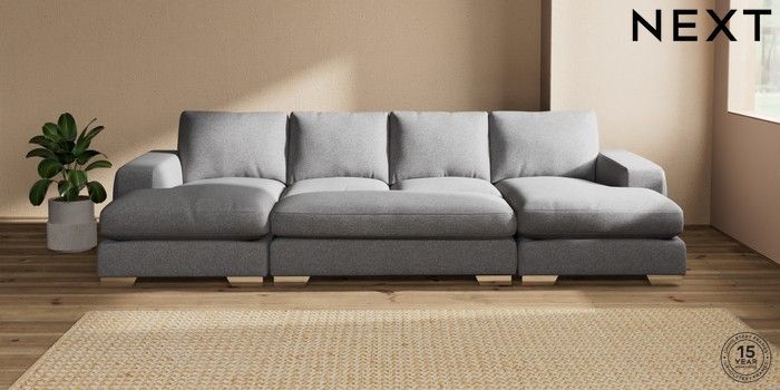 7.2.10 Houghton Deep Relaxed Sit Large - U Shaped Double Chaise with Footstool Studio Chenille Mid Grey Large Square Angle - Chrome Metal | Made Click here to use our website with more accessibility support, for example screen readers