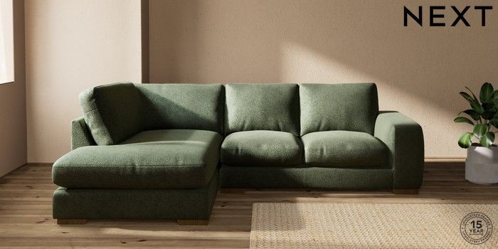 7.2.10 Houghton Deep Relaxed Sit Medium Corner Chaise - Left Hand Boucle Chenille Dark Moss Green Large Square Angle - Mid | Made Click here to use our website with more accessibility support, for example screen readers