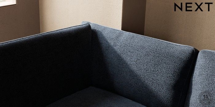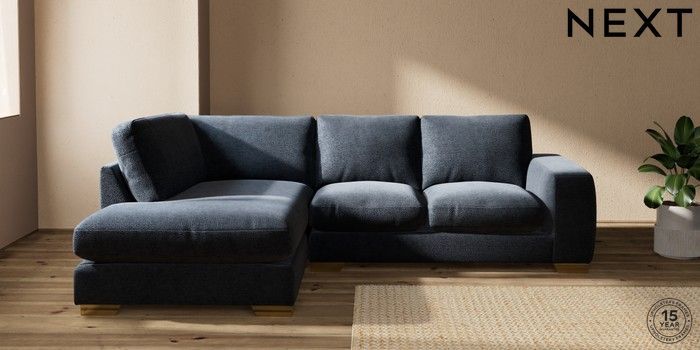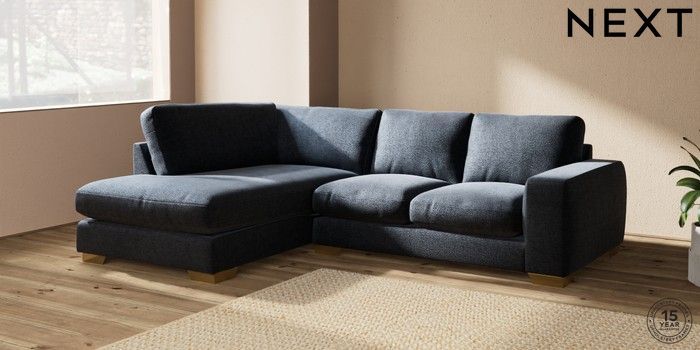 7.2.10 Houghton Deep Relaxed Sit Medium Corner Chaise - Left Hand Boucle Chenille Dark Slate Blue Large Square Angle - Brushed Brass | Made Click here to use our website with more accessibility support, for example screen readers