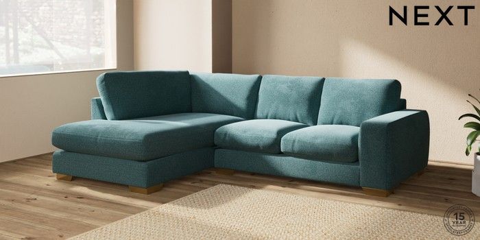 7.2.10 Houghton Deep Relaxed Sit Medium Corner Chaise - Left Hand Chunky Chenille Mid Teal Green Large Square Angle - Brushed Brass | Made Click here to use our website with more accessibility support, for example screen readers