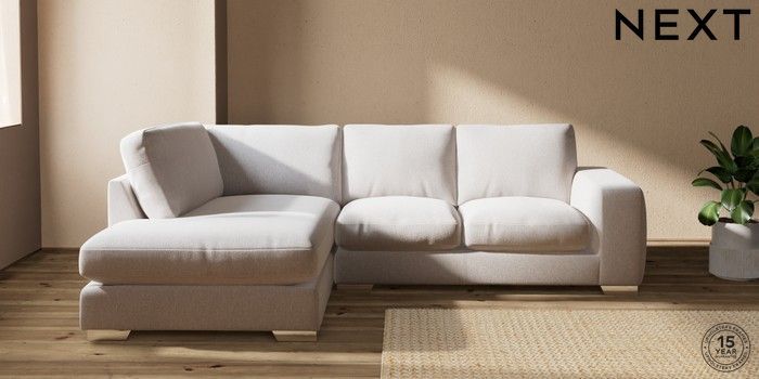 7.2.10 Houghton Deep Relaxed Sit Medium Corner Chaise - Left Hand Cotswold Chenille Oyster Large Square Angle - Chrome Metal | Made Click here to use our website with more accessibility support, for example screen readers