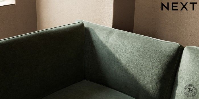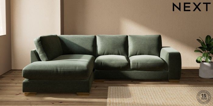 7.2.10 Houghton Deep Relaxed Sit Medium Corner Chaise - Left Hand Luxe Chenille Mid Green Large Square Angle - Brushed Brass | Made Click here to use our website with more accessibility support, for example screen readers