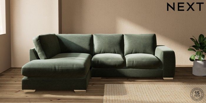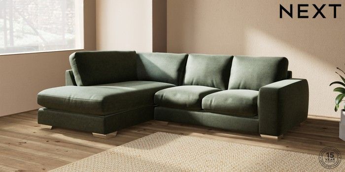 7.2.10 Houghton Deep Relaxed Sit Medium Corner Chaise - Left Hand Luxe Chenille Mid Green Large Square Angle - Chrome Metal | Made Click here to use our website with more accessibility support, for example screen readers