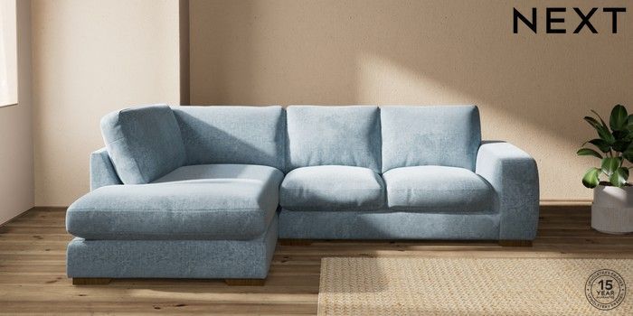 7.2.10 Houghton Deep Relaxed Sit Medium Corner Chaise - Left Hand Plush Chenille Light Blue Large Square Angle - Mid | Made Click here to use our website with more accessibility support, for example screen readers