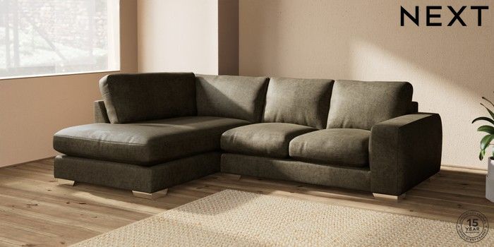 7.2.10 Houghton Deep Relaxed Sit Medium Corner Chaise - Left Hand Plush Chenille Moss Green Large Square Angle - Chrome Metal | Made Click here to use our website with more accessibility support, for example screen readers