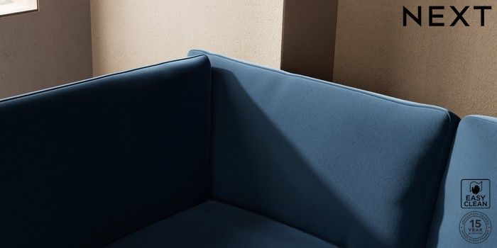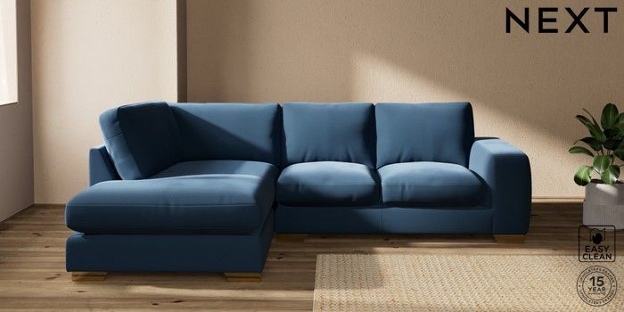 7.2.10 Houghton Deep Relaxed Sit Medium Corner Chaise - Left Hand Plush Velvet Easy Clean Airforce Blue Large Square Angle - Brushed Brass | Made Click here to use our website with more accessibility support, for example screen readers