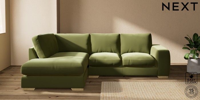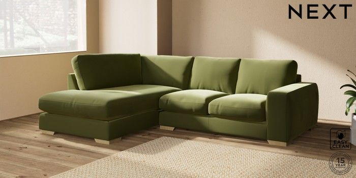 7.2.10 Houghton Deep Relaxed Sit Medium Corner Chaise - Left Hand Plush Velvet Easy Clean Mid Olive Green Large Square Angle - Light | Made Click here to use our website with more accessibility support, for example screen readers