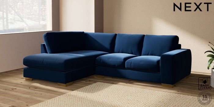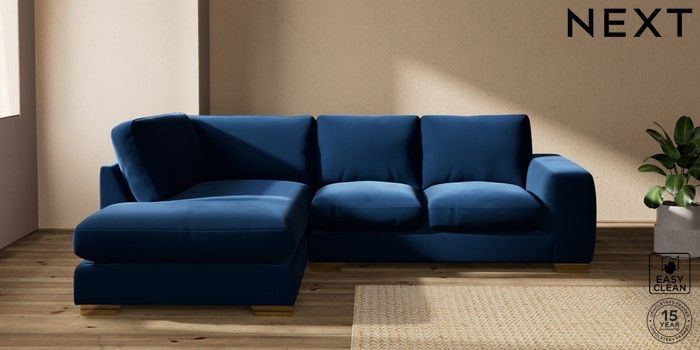 7.2.10 Houghton Deep Relaxed Sit Medium Corner Chaise - Left Hand Plush Velvet Easy Clean Navy Blue Large Square Angle - Brushed Brass | Made Click here to use our website with more accessibility support, for example screen readers