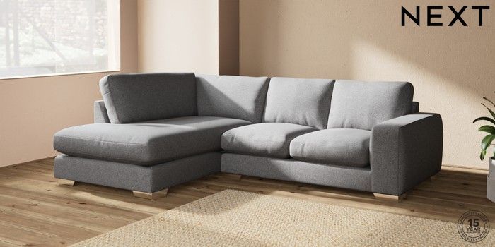 7.2.10 Houghton Deep Relaxed Sit Medium Corner Chaise - Left Hand Studio Chenille Mid Grey Large Square Angle - Chrome Metal | Made Click here to use our website with more accessibility support, for example screen readers