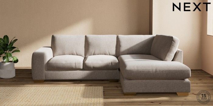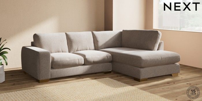 7.2.10 Houghton Deep Relaxed Sit Medium Corner Chaise - Right Hand Chunky Chenille Light Dove Large Square Angle - Brushed Brass | Made Click here to use our website with more accessibility support, for example screen readers
