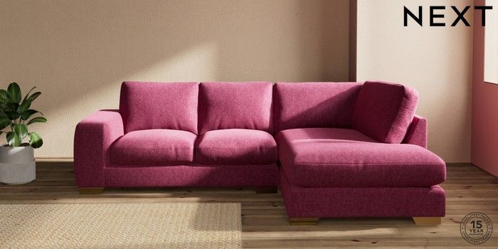 7.2.10 Houghton Deep Relaxed Sit Medium Corner Chaise - Right Hand Cotswold Chenille Dark Raspberry Pink Large Square Angle - Brushed Brass | Made Click here to use our website with more accessibility support, for example screen readers