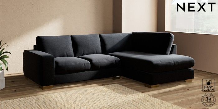7.2.10 Houghton Deep Relaxed Sit Medium Corner Chaise - Right Hand Fine Chenille Easy Clean Black Large Square Angle - Brushed Brass | Made Click here to use our website with more accessibility support, for example screen readers