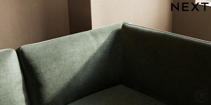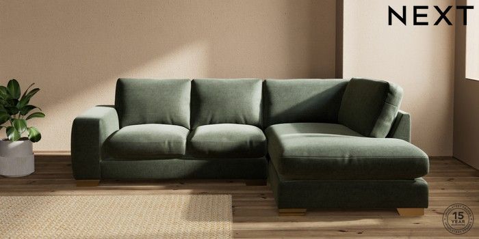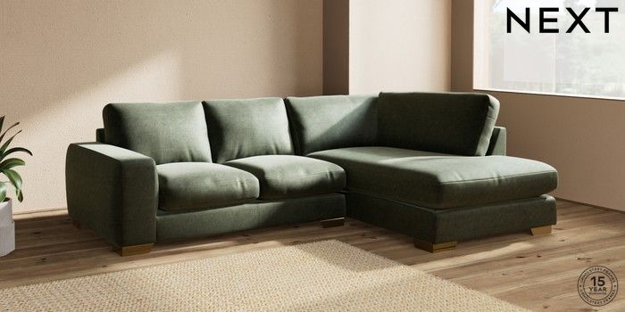 7.2.10 Houghton Deep Relaxed Sit Medium Corner Chaise - Right Hand Luxe Chenille Mid Green Large Square Angle - Brushed Brass | Made Click here to use our website with more accessibility support, for example screen readers