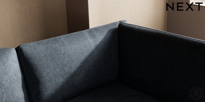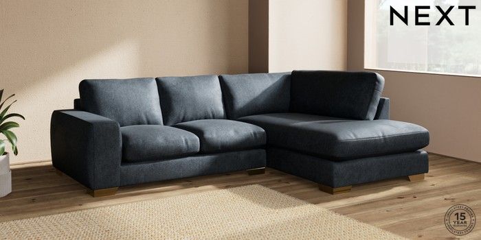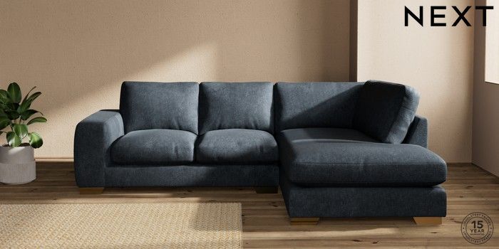 7.2.10 Houghton Deep Relaxed Sit Medium Corner Chaise - Right Hand Plush Chenille Slate Blue Large Square Angle - Brushed Brass | Made Click here to use our website with more accessibility support, for example screen readers